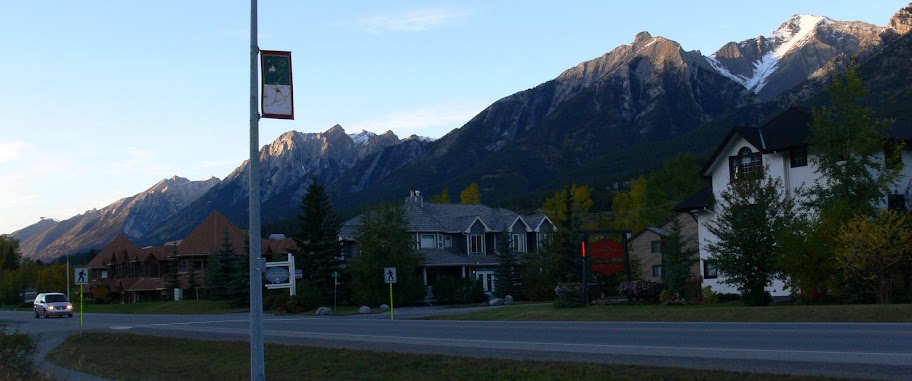 下塌Bear County lodge, $49 一晚,待四个晚上。小旅馆非常干净舒服,两张大床,前台的接待生是好看的加拿大美美。我们的旅馆后面有铁轨,而"三姐妹"雪山也宁静的站在远远的天边。 CANMORE是个小镇,两条街,都是大大小小的旅馆和饭店们。已是在洛基山脉区,大雪山们拥抱着小镇,我们也习已为常,一路高速公路我们已开始饱缆洛基雪山的秀色。雪山和绿头的山交错在一起,延绵不绝,阳光的变化,时时勾画不同的景色气向。