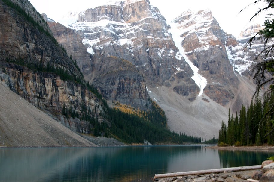 We took a brief walk around the Moraine lake. Somehow it was a bit disappointing. It was described as the double must see in area. But, the lake was small, the water was light blue with a hint of green. As a lot of lakes in the Rocky area, this is a galacier lake. It's feed by meltwater from the surrouding galacial peaks. "The glaciers grind the rock beneacth them in to fine power, called rock flour. Meltwater wash this powder into the lake, the resulant slity water absorbs all colors of incoming light, except the striking turquoise and vivid blue that reflects back to our eyes." The note from the lakeside tells the secret of the lake. Walter Wilcox was the first white reached it in 1899. He wrote "no scene has given me an equal impression of inspring solitude and rugged grandeur". However, we didn't feel the same.