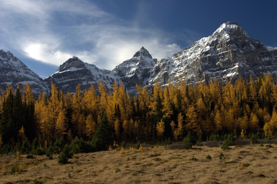 再回湖边,沿山向上,我们要去LARCH谷。一路辛苦爬山,还担心着熊,山下路开始的地方挂着排子:6人以上才可上山(人多不怕熊?)。我们两个早起的鸟将山头占为己有,只希望熊熊不要来凑热闹。一小时的山路以后,终于到达LARCH谷。金黄的树林,九座雪峰环绕,风过,草矮。晓楠高高兴兴的啪呀啪,“今天的任务完成了。”同感。