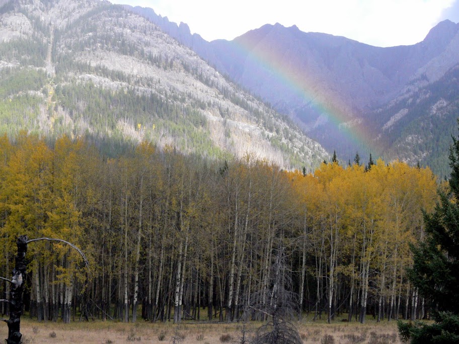 下午开经BOW VALLEY 大道,停停走走,看了瀑布。但还是金黄的树林让我们惊艳。 阳光照在一片白桦林上,我们弃车而下,拍。5分钟后,居然下雨。我们仍然拍个不停。1分钟后,一道彩虹出现。